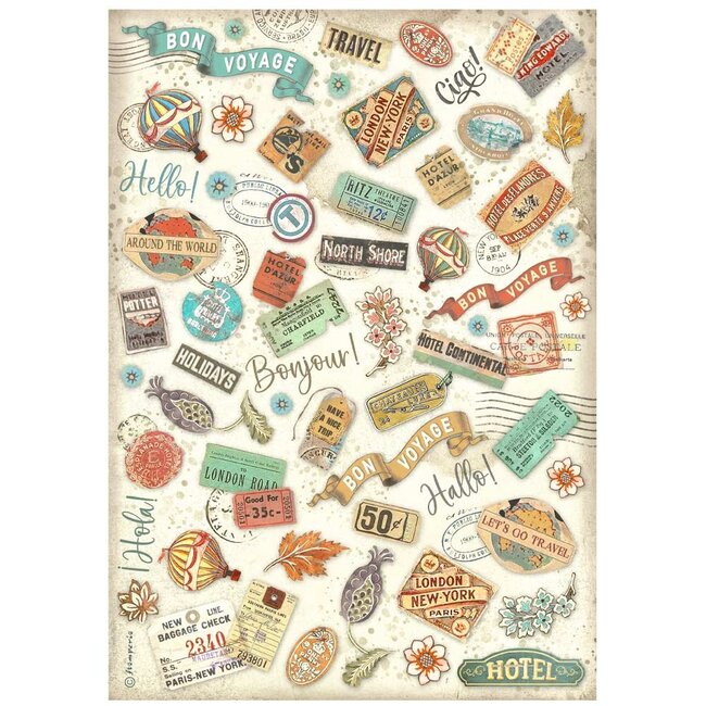 Stamperia A4 Rice paper packed - Art of Travelling labels